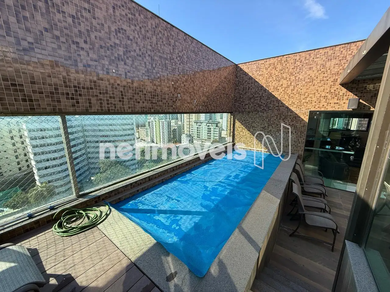 Área externa com gourmet, teto retrátil e piscina aquecida.
